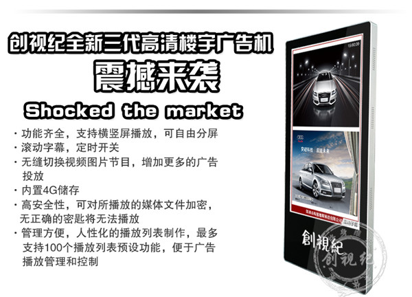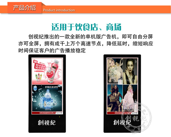 對(duì)比性 | 看家本領(lǐng): ★成本低,能滿足常規(guī)的廣告機(jī)播放功能; ★高清1080P視頻、圖片播放; ★一鍵拷貝節(jié)目、支持 HDMI接口輸入,可當(dāng)顯示器之用。不足之處:豎屏片源需要第三方軟件制作、剪輯。分屏制作繁瑣。 | 看家本領(lǐng): ★解決客戶橫豎屏轉(zhuǎn)換問題,可自動(dòng)對(duì)應(yīng)機(jī)器旋轉(zhuǎn)視頻; ★內(nèi)置4G內(nèi)存,烤貝快、播放穩(wěn)定、永不卡殼; ★真正客戶自由分屏,真正的實(shí)現(xiàn)視頻,圖片,字幕,日期的隨機(jī)組合;想怎么分就怎么分; ★目前唯一能真正實(shí)現(xiàn)節(jié)目之間的無縫切換的方案; ★疊加背景圖片,使畫面更美觀; ★雙芯片、真正1080P的全高清解碼;目前只有我們和分眾傳媒使用此方案。 | 看家本領(lǐng): ★遠(yuǎn)程控制、管理、下發(fā)節(jié)目; ★兼容更多格式,天氣預(yù)報(bào)等,內(nèi)容豐富,操作so easy! ★后臺(tái)軟件功能強(qiáng)大,關(guān)鍵點(diǎn)是穩(wěn)定,支持同時(shí)上萬終端在線; ★隨機(jī)搭配服務(wù)器安裝軟件; ★擴(kuò)展性強(qiáng)、可安裝任意APP,滿足你的任何任性; ★支持阿里云服務(wù)器,強(qiáng)大的技術(shù)支持。真正的廣告媒體運(yùn)營(yíng)最佳選擇,穩(wěn)定壓到一切。不足之處:暫時(shí)沒有(這個(gè)可以有,這個(gè)真沒有...) |