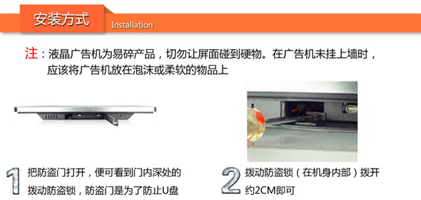 控制方式 | 通過U盤,SD卡播放播放 | 通過U盤,SD卡更新節(jié)目,直接將內(nèi)容導(dǎo)入機(jī)器內(nèi)存,(內(nèi)置4G 內(nèi)存)優(yōu)點(diǎn):客戶無需另配內(nèi)存卡;拷貝速度快 | 通過電腦用網(wǎng)絡(luò)(支持有線,wifi,可選3G)連接廣告機(jī),電腦后臺(tái)統(tǒng)一遠(yuǎn)程控制、管理 |