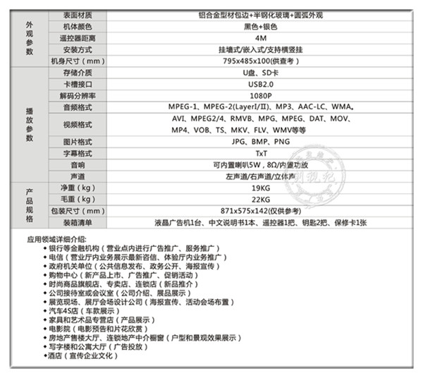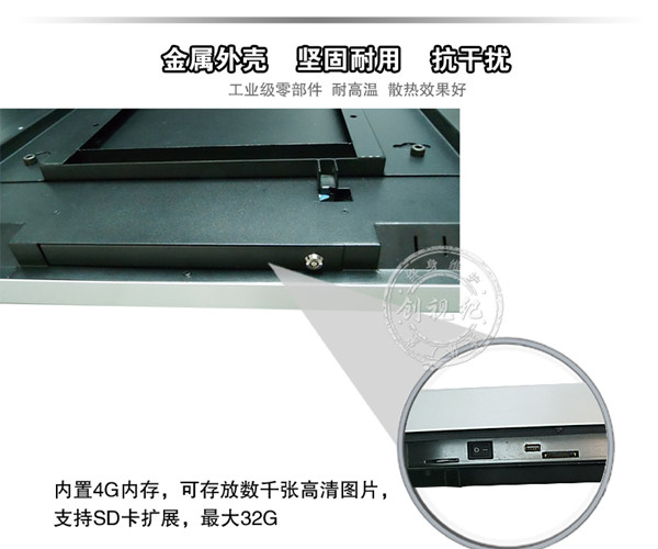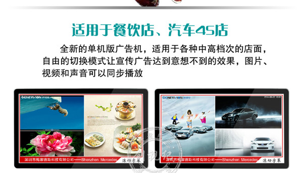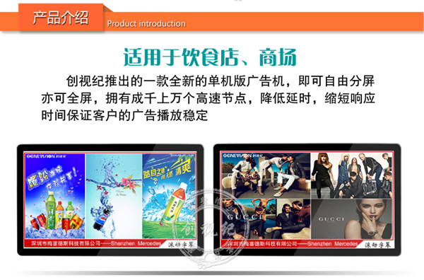 1、機器板貼4G內存,播放更流暢2、任意自由分屏3、橫版視頻自動旋轉成豎版4、視頻圖片無縫切換,節省更多的播放時間,為你賺更多的廣告費5、海量行業模板贈送6、支持背景疊加從而廣告節界面更加美觀/以上為創視紀廣告機行業獨有功能,豎屏機不需為重新制作豎式節目而煩,廣告機功能最大化,十分人性化,便捷