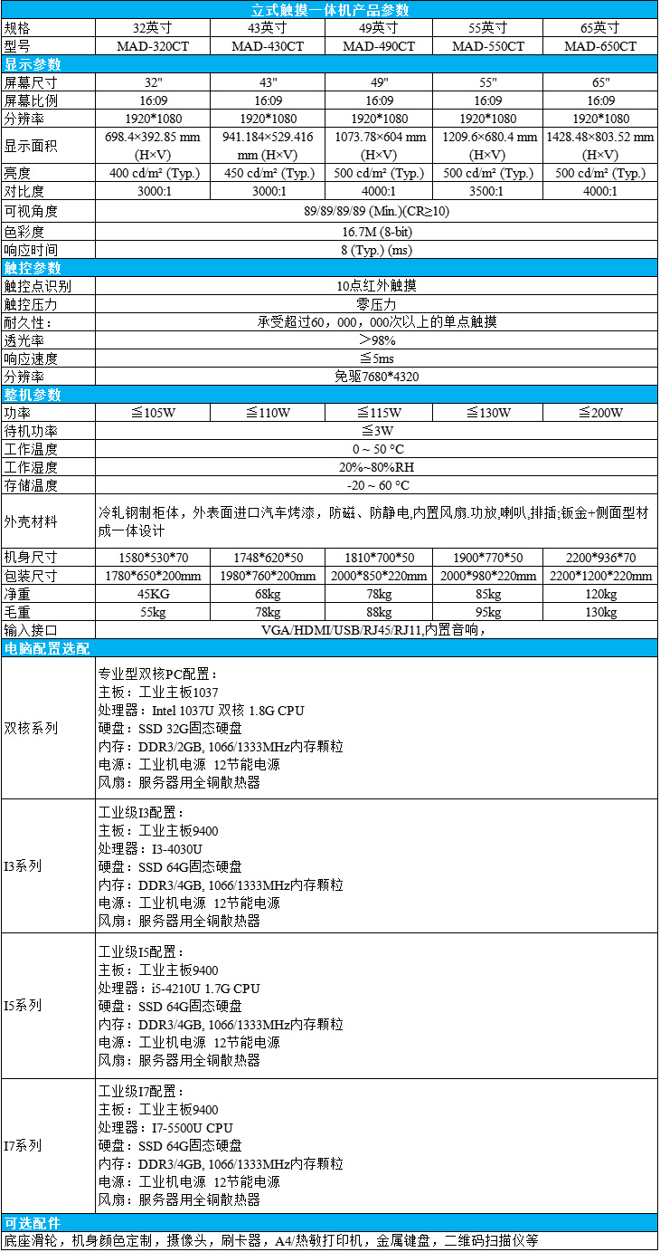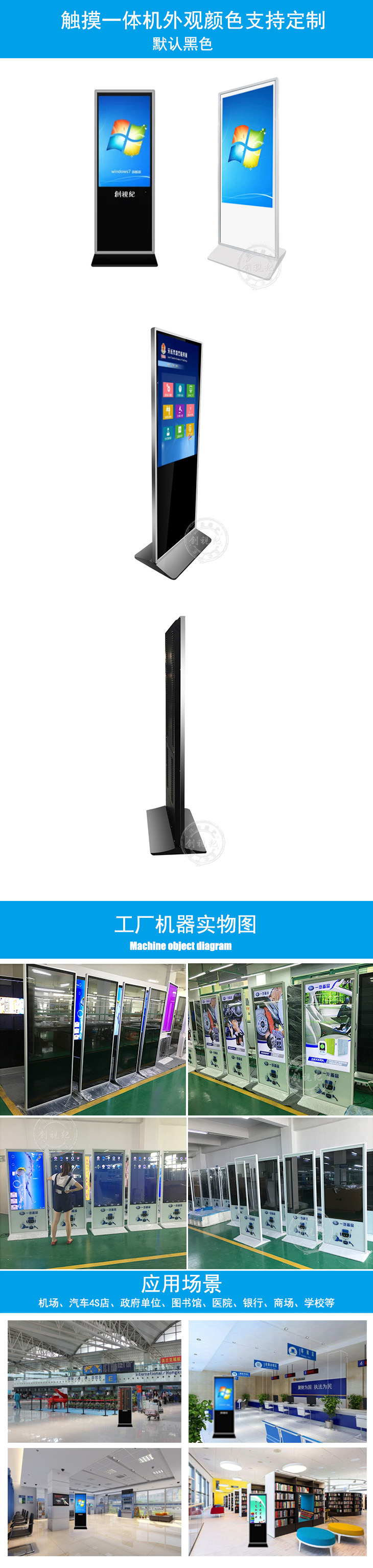 觸摸屏查詢一體機是一款智能觸摸查詢設備。它集觸控、液晶顯示、電腦主機于一體,可用于觸控互動、查詢信息多媒體教學等。觸摸一體機主體由流暢的直線構成,簡約,時尚,符合現代社會流行趨勢。整體造型設計利于人體機學設計,使用戶擁有更舒適、更便捷、更貼心的視覺觸覺雙重體驗。外觀款式有分壁掛式,落地式,臥式,適用不同的應用場所。