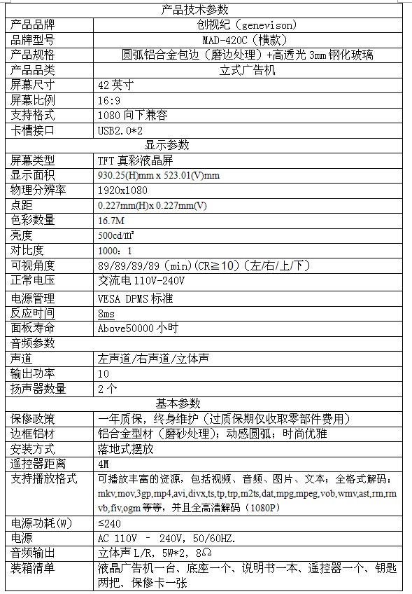 液晶屏尺寸     42 寸TFT真彩液晶屏