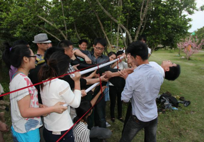 李總親自在準備游戲道具,穿越火線規則,將隊員從用紅線圈成的逃生圈穿過,人的身體其任何衣物不許碰到線,若碰到線,則過去的人員全部返回重新來過。