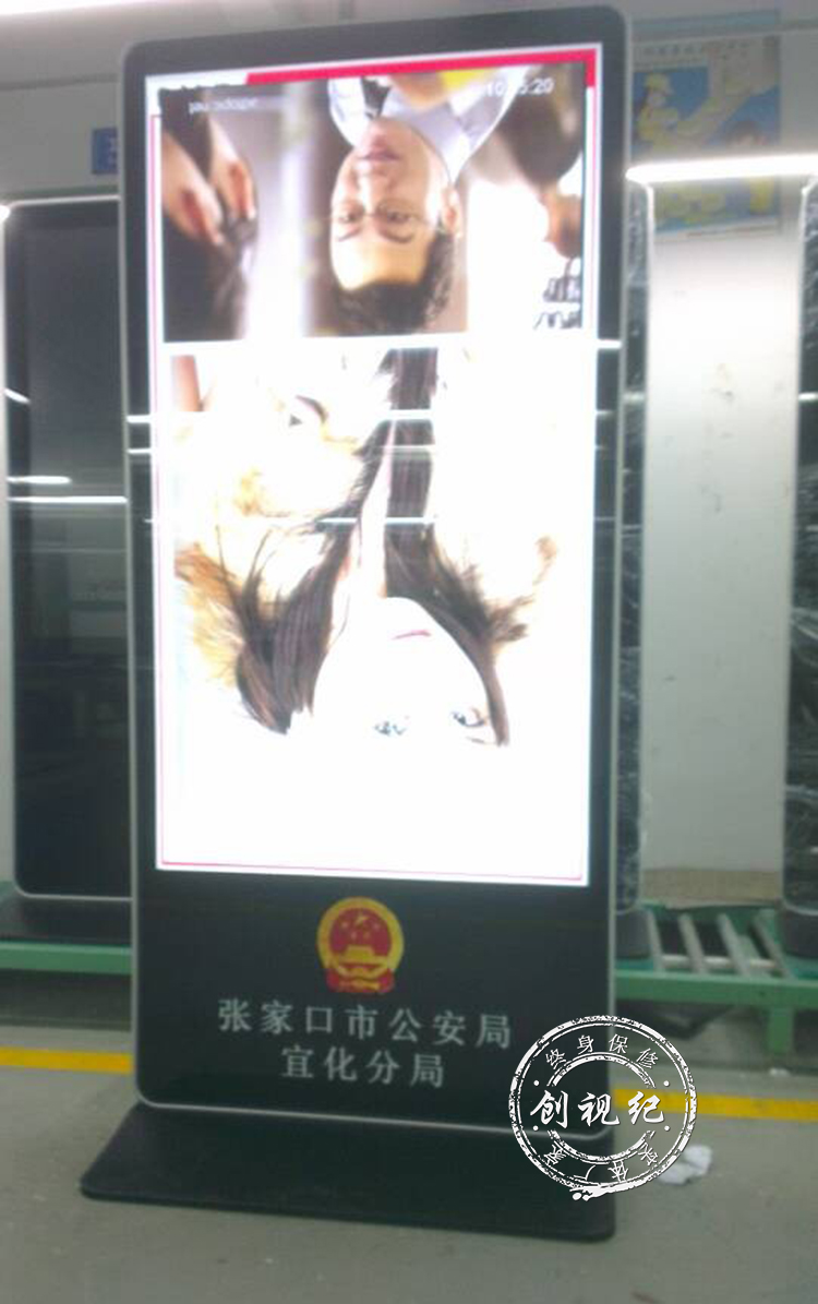 此次65寸立式廣告機,專門為宣化公安局定做,整體機身厚度只有45mm,其后背也并沒有突出的部分,這樣顯得機身非常的纖薄,渾然一體,機身正面尾部專門印有莊嚴的國徽,下方是“張家口市公安局,宣化分局”字樣。