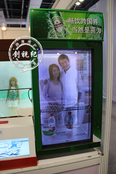 想喝冷飲,不需開冰箱門就能知道里面放著什么牌子的飲料,透視眼一定驚到小伙伴。透明廣告冰箱讓商家的冰箱也成了流媒體主戰場。當然也有各種實物展示柜,展示臺;